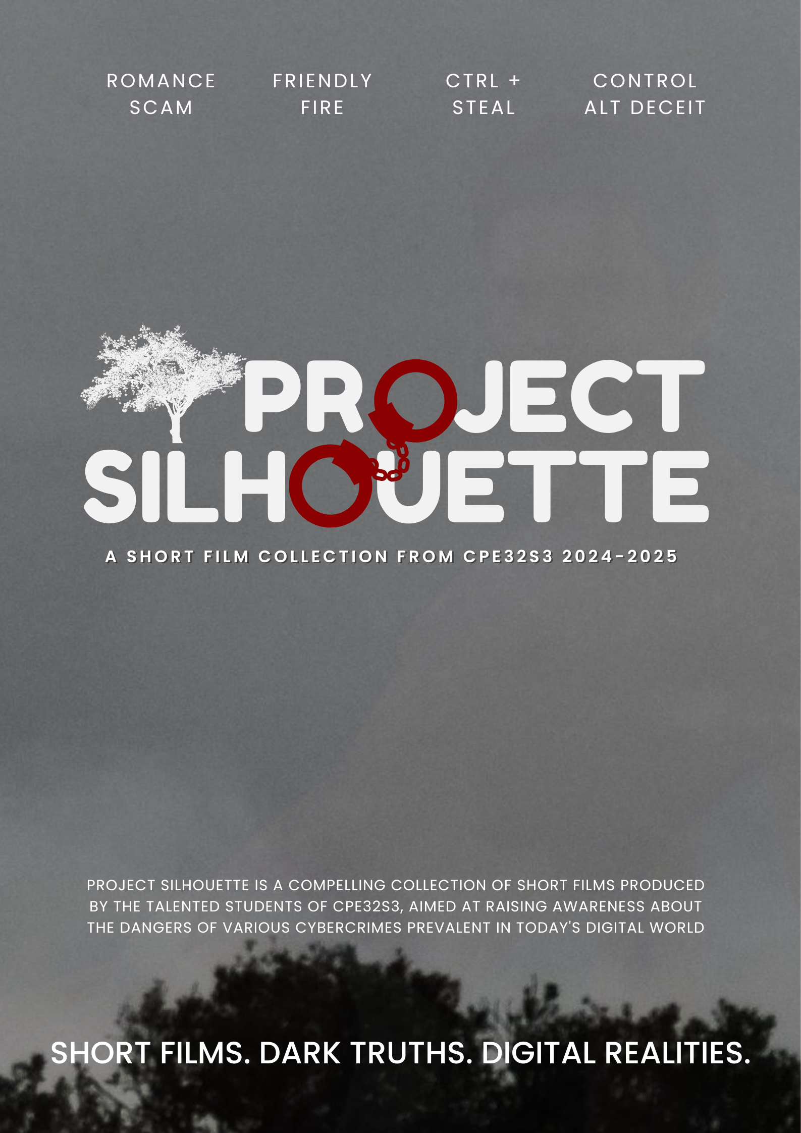 Project Silhouette is a compelling collection of short films produced by the talented students of CPE32S3, aimed at raising awareness about the dangers of various cybercrimes prevalent in today's digital world. Each film portrays realistic scenarios that highlight how individuals can fall victim to threats such as phishing, identity theft, cyberbullying, online scams, and data breaches. Through engaging storytelling and thoughtful direction, the project seeks to educate viewers on the importance of cybersecurity, responsible internet use, and how to protect themselves in the ever-evolving online landscape.